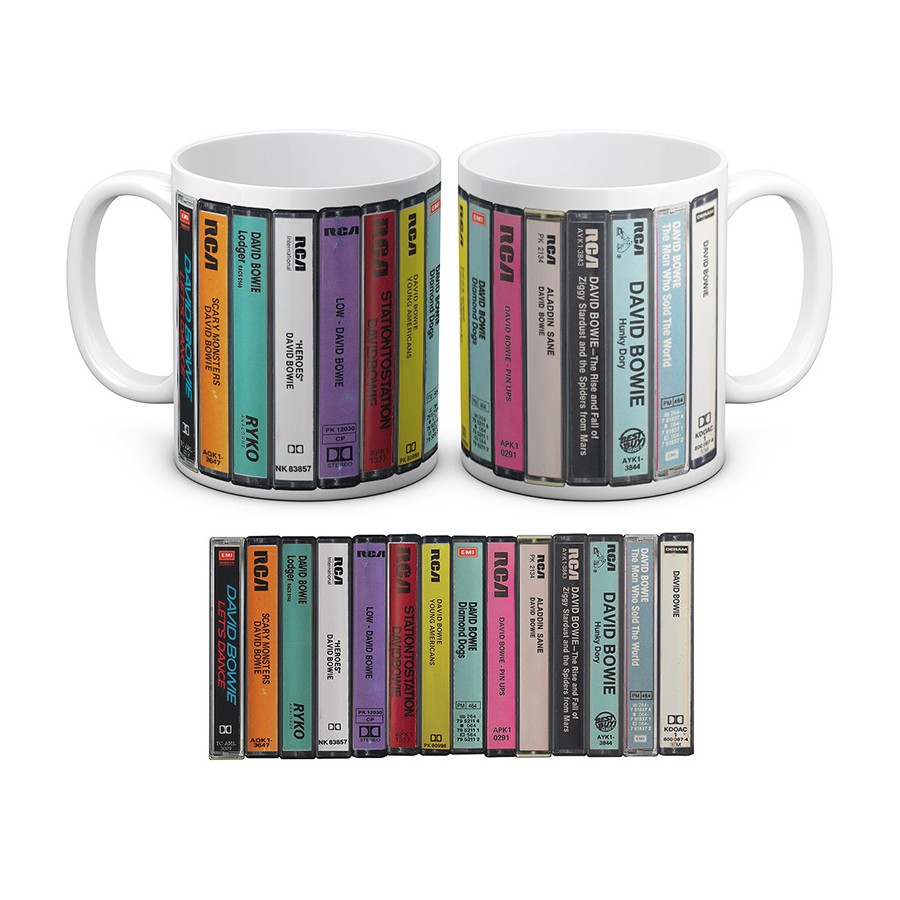 El diseño de esta taza se inspira en la era en la que muchos descubrieron a Bowie en cassette, ya fuera heredando cintas familiares, grabando recopilatorios o comprando ediciones que se escuchaban una y otra vez en el walkman. Los cassettes ilustrados evocan discos esenciales como The Rise and Fall of Ziggy Stardust and the Spiders from Mars, Heroes, Low o Let’s Dance, cada uno asociado a un sonido y una estética distinta. Es como tener un pequeño archivo visual de su carrera sobre la mesa, condensando en un vistazo varias décadas de reinvenciones.