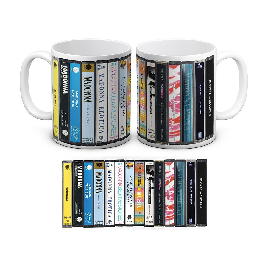 El diseño de esta taza se inspira en la era dorada del cassette, cuando descubrir a Madonna significaba grabar canciones de la radio, intercambiar cintas entre amigos y aprenderse coreografías viendo videoclips una y otra vez. Los cassettes ilustrados evocan distintas etapas de su carrera: el pop descarado y colorido de los ochenta, la sofisticación electrónica de finales de los noventa y los himnos de pista que convirtieron muchas de sus canciones en clásicos instantáneos de discoteca. Es una imagen que conecta directamente con habitaciones llenas de pósters, walkmans siempre encendidos y televisores sintonizados en programas musicales.