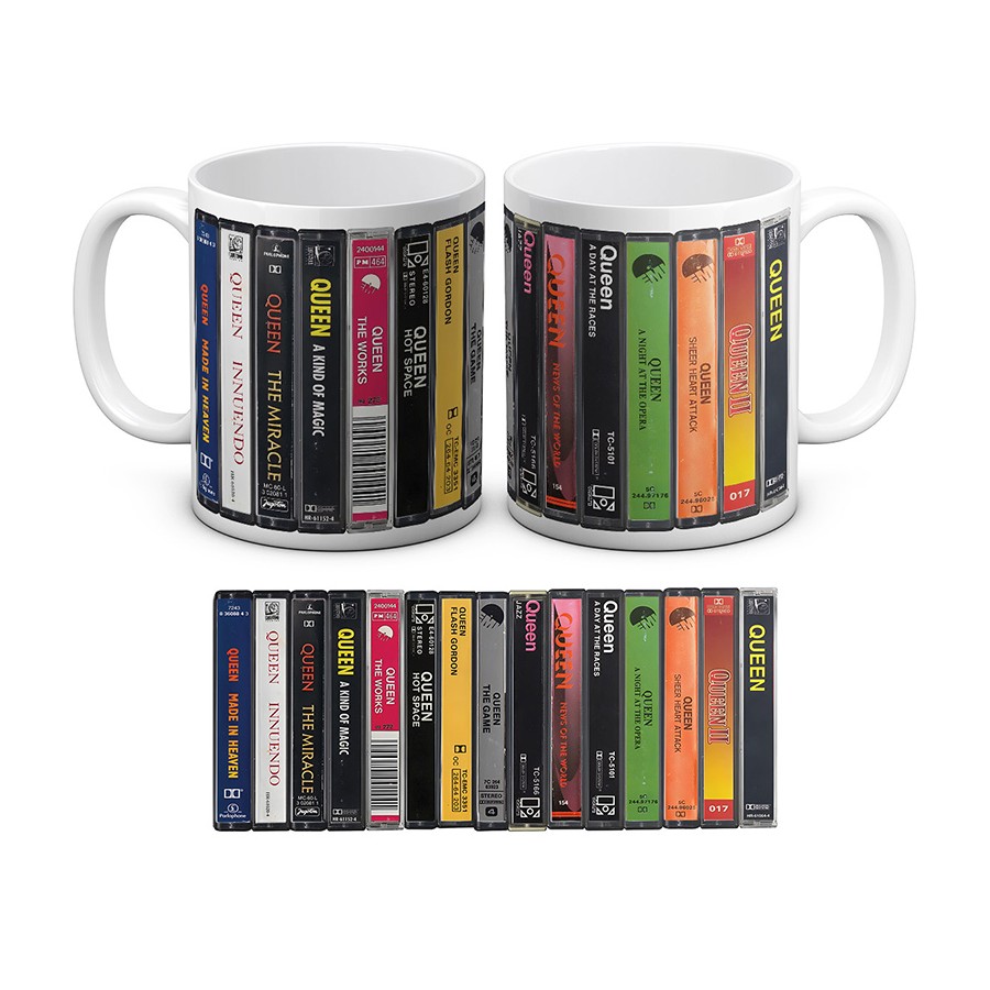 El diseño de esta taza nos lleva directamente a esa época en la que escuchar a Queen en cassette era casi un ritual: darle la vuelta a la cinta a mitad del disco, rebobinar para repetir un solo de guitarra, aprenderse los coros a base de escucharlos una y otra vez. Los cassettes ilustrados evocan álbumes míticos como A Night at the Opera, donde nació “Bohemian Rhapsody”, News of the World con el tándem imbatible “We Will Rock You” / “We Are the Champions”, o The Game, que regaló al mundo “Another One Bites the Dust”. Cada cassette funciona como una pequeña cápsula de memoria, un recordatorio visual de esas canciones que siguen sonando en estadios, bares y casas de todo el planeta.
