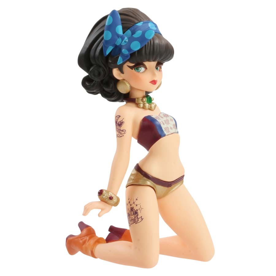La pose también cuenta. La figura está arrodillada, con el torso erguido y el cuerpo ligeramente girado. Ese planteamiento recuerda a la estética pin-up, pero pasada por un filtro contemporáneo de toy design japonés. Los accesorios refuerzan el concepto: pendientes, pulsera y un collar con detalle central que aporta un punto “joya” sin recargar la silueta.