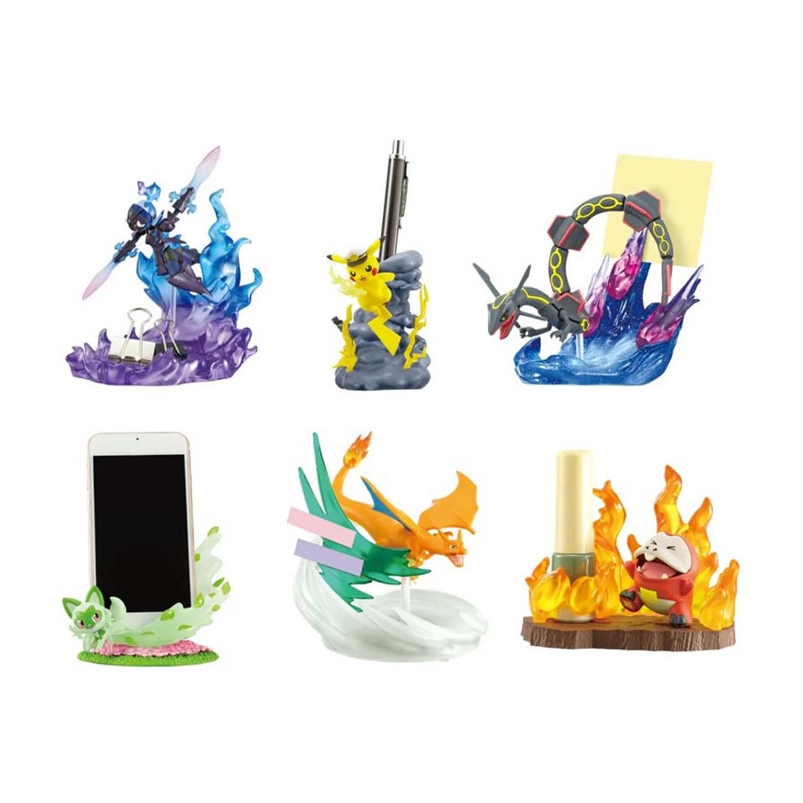 Pokémon Battle On Desk RE-MENT lleva el universo Pokémon a un formato muy concreto: pequeñas escenas de combate que se integran en tu mesa de trabajo. No son figuras sueltas sin más. Cada diseño está planteado como “desk figure”, con una base y un efecto visual potente, y en varios casos añade una función práctica para el día a día.
