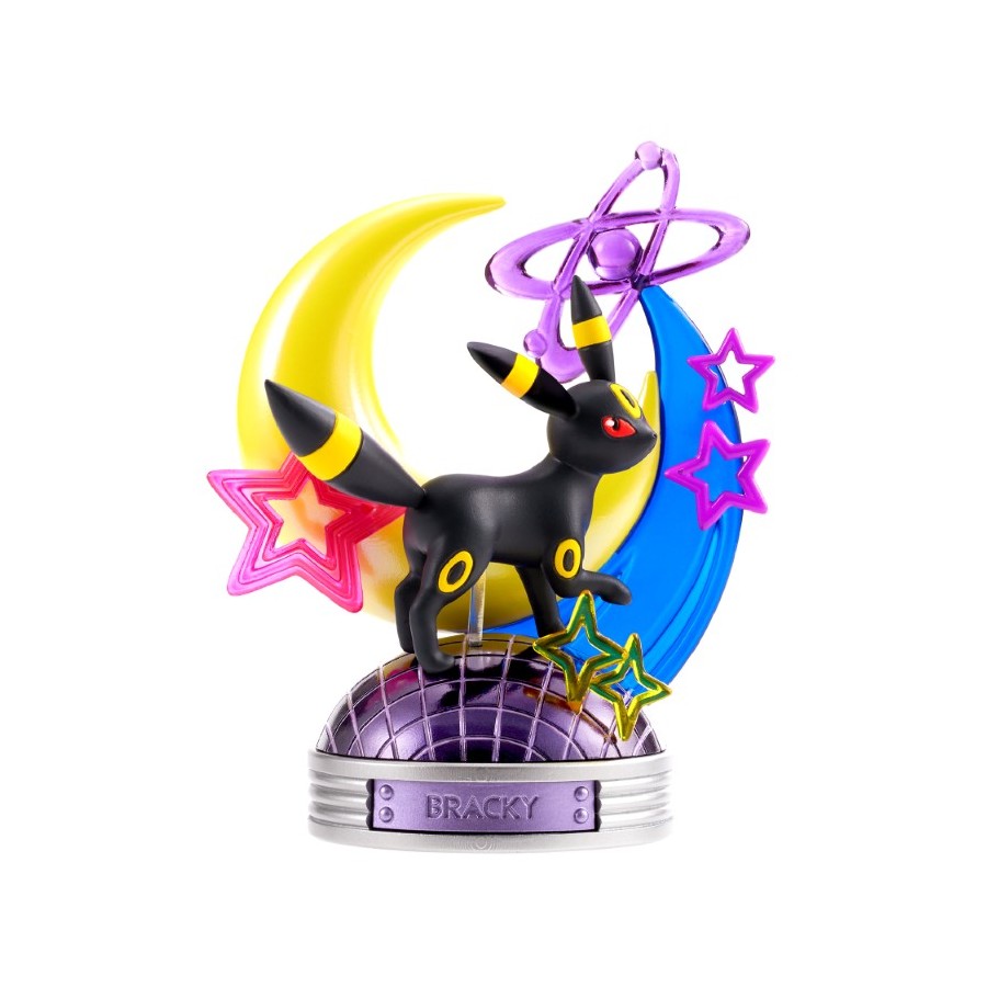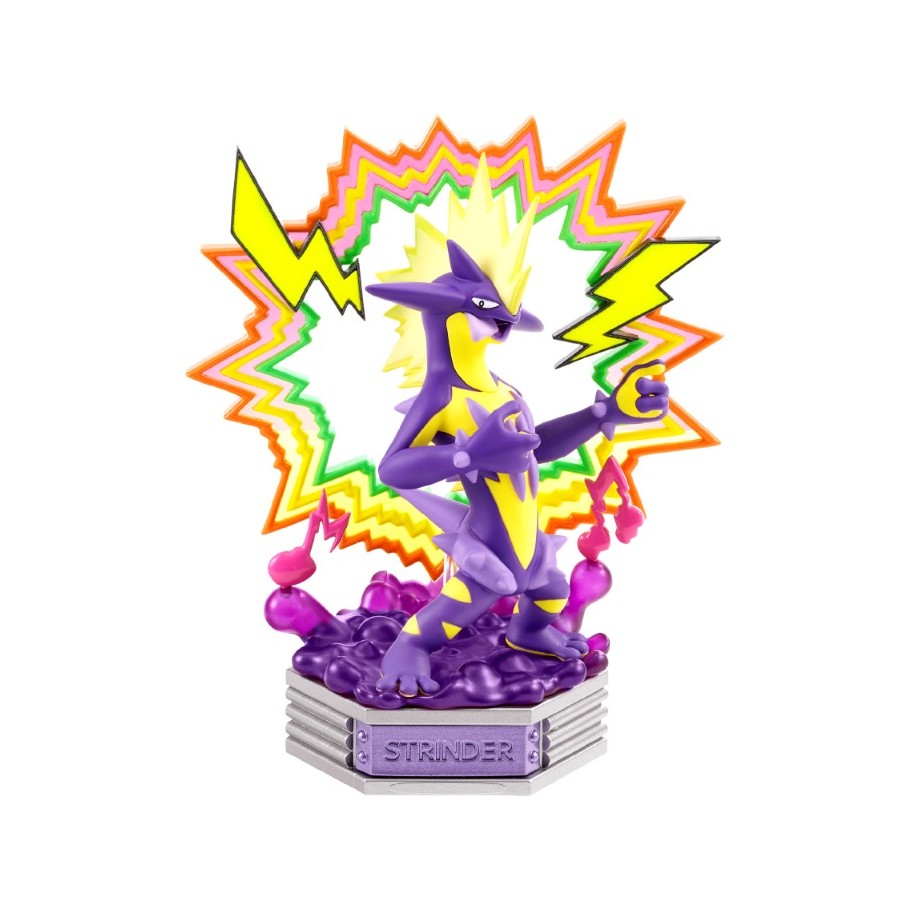 El lado más rockero llega con Toxtricity (High Form), con rayos y una composición agresiva. La pieza se apoya en una base que recuerda a un altavoz. Todo en ella habla de concierto. En contraste, Umbreon aporta un tono nocturno. Su silueta encaja perfecto con el tema neón. El arco y las estrellas refuerzan ese aire de noche urbana.