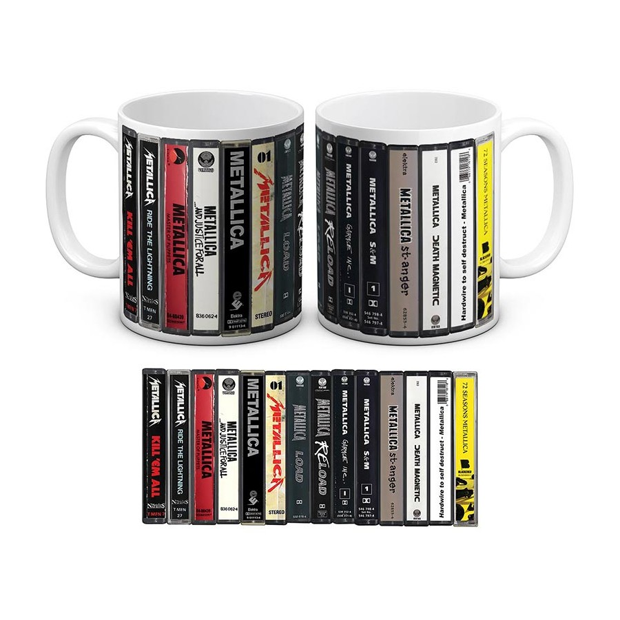 El diseño de esta taza viaja a una época en la que la música se vivía en formato físico, cuando escuchar un disco en cassette era casi un ritual: rebobinar, grabar mezclas, revisar las portadas y compartir cintas entre amigos. Aquí, esa nostalgia vuelve a la vida con una estética basada en cassettes que evocan discos esenciales como Kill ’Em All, Ride the Lightning, Master of Puppets o el histórico Black Album. Cada cassette presente en el diseño capta una etapa distinta del sonido que definió a Metallica.