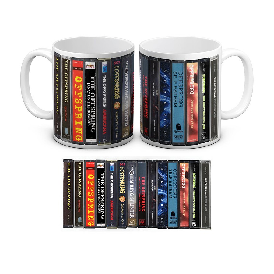 El diseño de esta taza recupera la estética clásica de los cassettes, un símbolo de aquella época en la que grabar una cinta con tus canciones favoritas era casi una declaración de identidad. Aquí, esa nostalgia toma forma a través de un collage de cassettes que representan distintos momentos del recorrido musical de la banda: desde la crudeza inicial de Ignition hasta la explosión mundial de Americana, donde nacieron temas tan reconocibles como “Pretty Fly (For a White Guy)” o “The Kids Aren’t Alright”. Cada cassette es un recordatorio visual del impacto que The Offspring dejó en generaciones enteras.