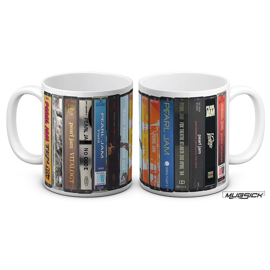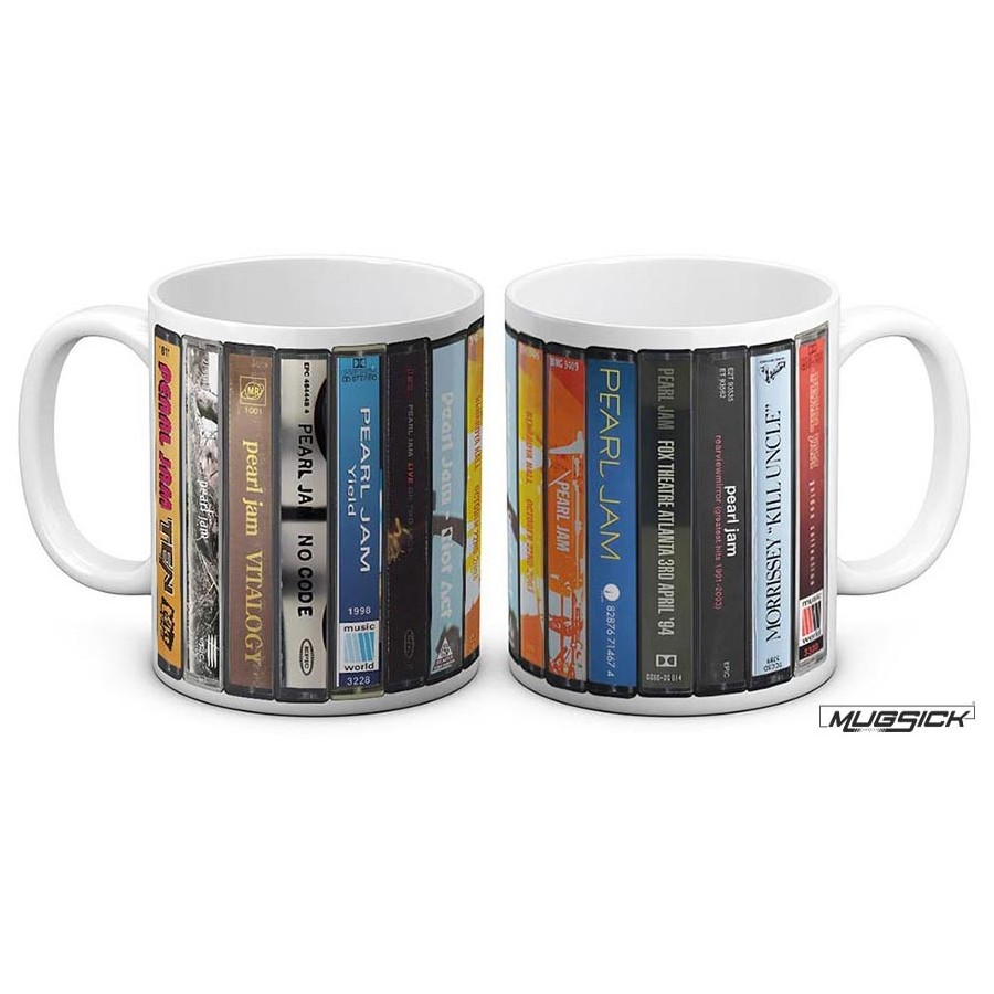 El diseño de la taza recrea una hilera de cassettes apoyados como en una estantería muy vivida. Cada lomo parece rescatado de una colección personal gastada a base de rebobinar. Es fácil imaginar ahí álbumes como Ten, Vs. o Vitalogy escuchados siempre de principio a fin. También hay espacio para recopilaciones caseras llenas de caras B y directos grabados desde la radio.
